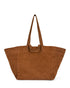 Soho Slouch Tote Bag Features a short handle and a longer shoulder handle. Finished in a rich deep tan suede, with a sleek magnetic fastening. Fully cotton lined with inner zipped pocket for your valuables.