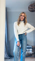 The Lucy blue frill knit is cosy and smart. With pearl details on the collar and cuff, this knit brings classic vibes to any outfit.